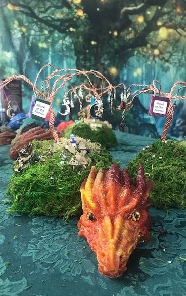 Yes, MARK OF THE FAERIE does have dragons, so my creative partner decided to join in the fun. Colorful resin dragons, devil cats, and charming faerie trees all add to the story, sitting alongside a set of books that are filled with a magical journey.